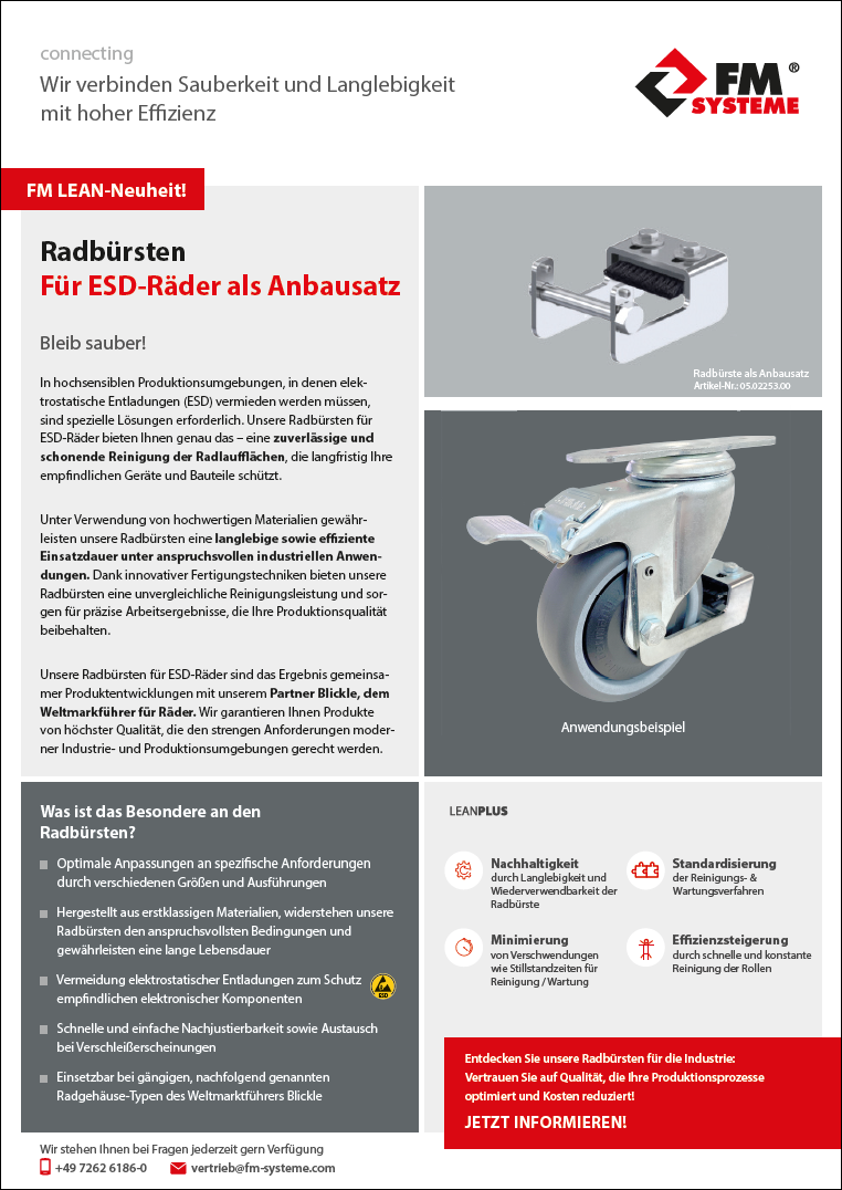 In hochsensiblen Produktionsumgebungen, in denen elektrostatische Entladungen (ESD) vermieden werden müssen, sind spezielle Lösungen erforderlich. Unsere Radbürsten für ESD-Räder bieten Ihnen genau das – eine zuverlässige und schonende Reinigung der Radlaufflächen, die langfristig Ihre empfindlichen Geräte und Bauteile schützt.